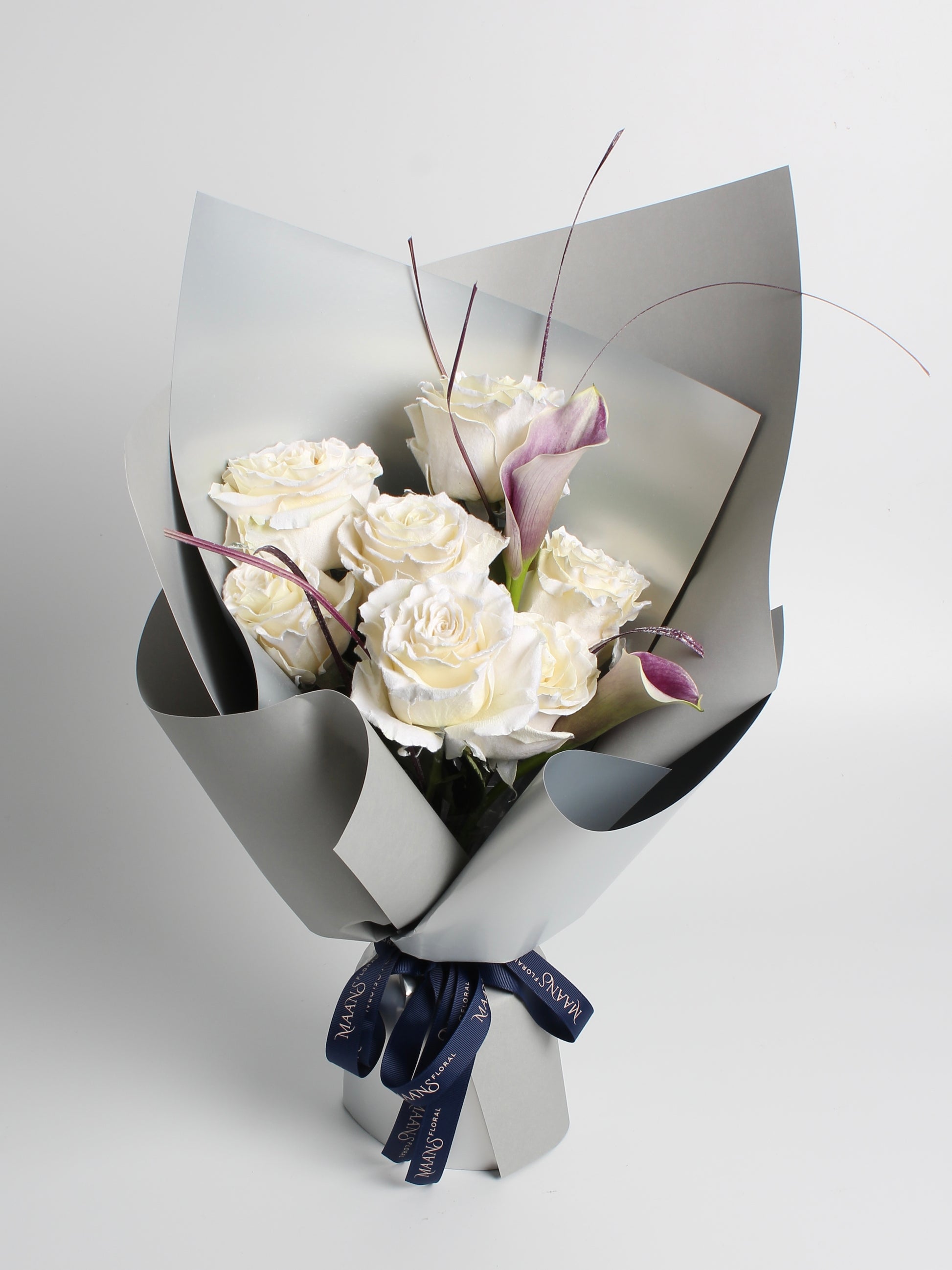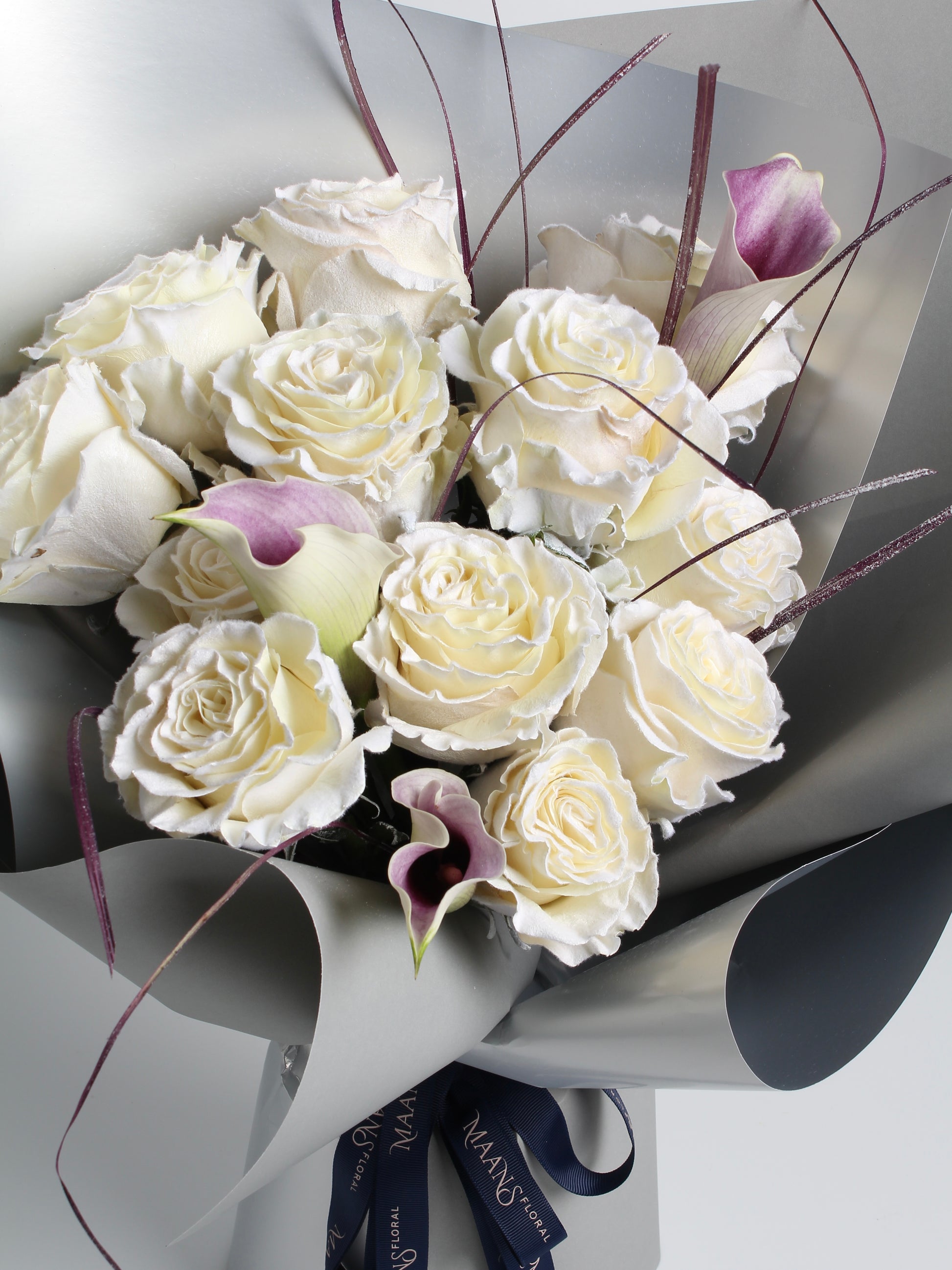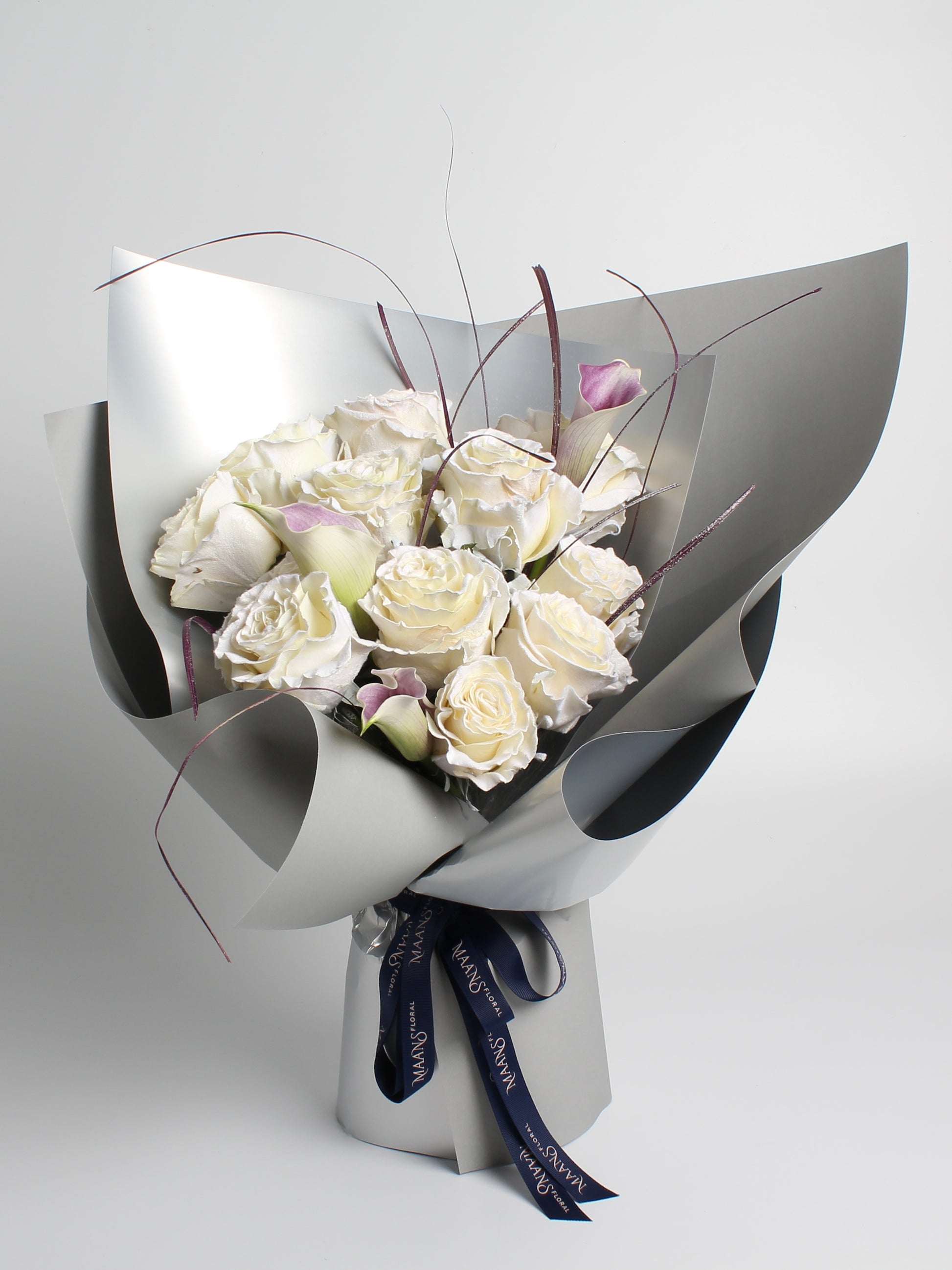 Our Ecuadorian roses, known as "Royal Roses," provide a lush, elegant core, while sleek calla lilies create a modern silhouette. Hand-dyed ornamental grass adds vitality, akin to an artist's final brushstroke.Wrapped in exquisite metallic floral paper, this packaging enhances the artwork, capturing light and making each arrangement a "dynamic sculpture" in harmony with its surroundings.