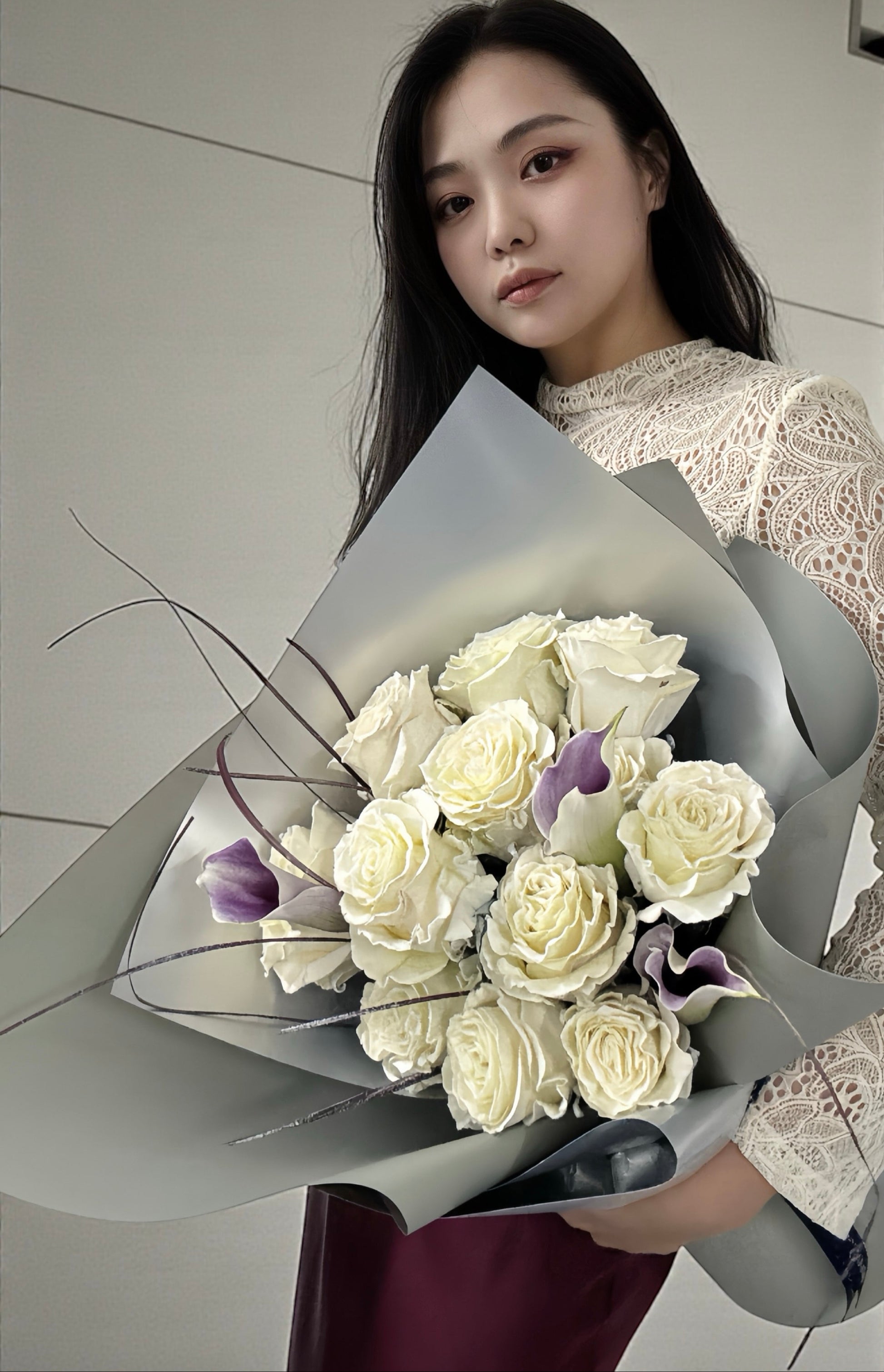 選用被譽為「皇家玫瑰」的厄瓜多爾玫瑰,其飽滿豐厚的花瓣,構成了雕塑溫潤而高貴的核心質感。搭配氣質優雅的馬蹄蘭,以其極簡而流暢的弧線,勾勒出充滿現代感的雕塑輪廓。再由我們花藝師親手染製的細葉芒草,如同藝術家在畫作完成前的最後一筆,為靜態的結構注入了靈動的氣息與生命力。最後以特選的金屬質感花紙輕裹。在不同光線下折射出變幻的光澤,讓整件花禮成為一座與環境對話的「動態雕塑」。